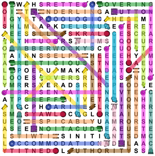 Each entry in the word search has its first letter replaced with an icon, and all words in a set share the same icon.