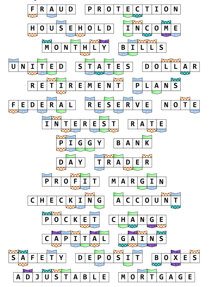 Each entry in the boxes is a common money-related phrase. Unlike a traditional letter links puzzle, the connected letters from one entry to the next are not the same letter, but instead are all mappings from a shared alphabetic cipher (consistent with the directionality of the arrows). Thus, any boxes in the same entry that have the same arrow type and direction attached to it are also the same letter. All pairs of letters that are present between two entries that are a mapping in the shared cipher are given arrows. The graduate puzzle provided the initials of each word, and the undergraduate version provided every letter that was not linked.